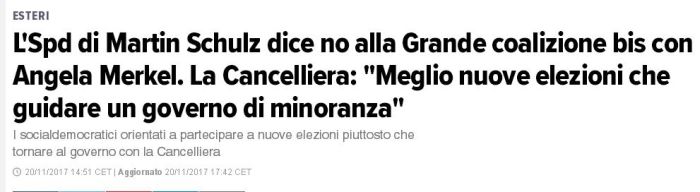 Ora, i saputelli dicono che bisognerà aspettare Pasqua per vedere il nuovo governo tedesco in tutto il suo splendore, visto che serviranno più di due mesi, oltre ai quattro già trascorsi dalle elezioni per trovare un accordo, per individuare chi ne farà parte. Caso vuole che anche da noi la pasqua dovrebbe servire a far resuscitare un governo dopo le elezioni marzoline. Una vera rimpatriata.