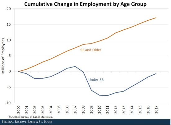 Sono i soli che hanno contributo alla crescita dei posti di lavoro, o che di questo aumento si sono giovati, mentre i più giovani, che oggi vengono considerati under 55, sono a saldo zero, o poco più.