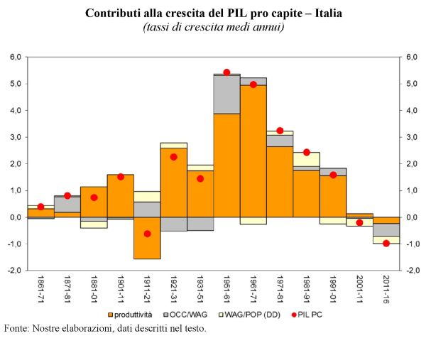 Interessante osservare anche il confronto con altri paesi, in particolare Germania, Francia, Spagna, Gran Bretagna e Usa. Emerge che “in Italia il contributo della produttività alla crescita del prodotto pro capite è per quasi tutto il Novecento più alto della media degli altri paesi, diviene significativamente negativo nel primo decennio del nuovo millennio”. In generale “il contributo della struttura demografica italiana è decisamente negativo e inferiore agli altri paesi avanzati”, e sarebbe stato anche peggiore “se non fosse intervenuto negli ultimi 25 anni un significativo flusso migratorio in entrata”. Nel 1981, i cittadini stranieri residenti in Italia erano poco più di 200.000, lo 0,4 per cento della popolazione, mentre sono diventati poco più di 5,1 milioni all’inizio del 2018, l’8,4 per cento della popolazione. L’immigrazione ha avuto effetti positivi sulla crescita, per la semplice ragione che ha aumentato il numero di persone in età lavorativa.