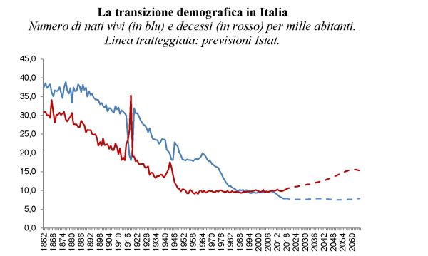 Il dato è sconfortante perché non rappresenta un episodio, ma una chiara tendenza confermata dalle rilevazioni Istat. Il paper di Bankitalia ci consente di avere una buona visione d’insieme nel lungo periodo. Il tasso di natalità in Italia ha un andamento declinante ormai secolare.