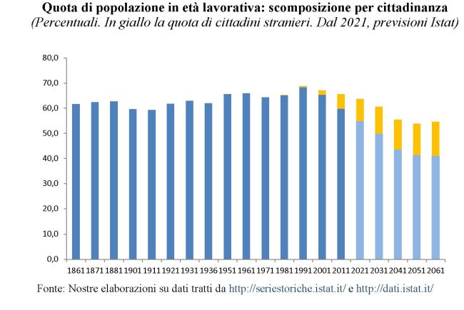 Ci sarebbe da chiedersi come mai il cambiamento strutturale della nostra popolazione, che ha condotto i più anziani a superare i più giovani, si sia innescato dal secondo dopoguerra, per accelerare vistosamente dalla fine degli anni ’80. Ma il discorso ci porterebbe troppo lontano. Ci basti sapere che nel 2017 gli anziani sono il 165% dei giovani 0-14 enni, e tale rapporto è previsto in crescita. Ciò impatterà sul totale delle persone in età lavorativa, che diminuisce da venticinque anni. L’immigrazione contribuirà a rallentare questa flessione. Si stima che nel 2061 un quarto della popolazione in età lavorativa sarà composta da stranieri. Se così non fosse, la quota dei 15-64enni, ossia la popolazione in età lavorativa, scenderebbe al 40% del totale. Ma pure con l’ingresso degli stranieri non si supererà il 55%.