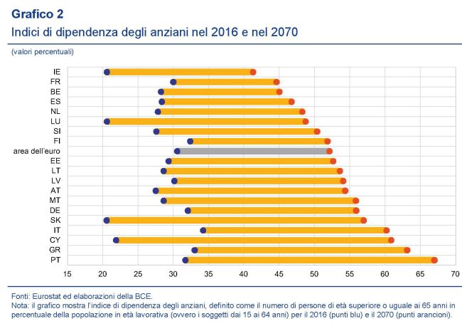 Questo trend ha un effetto determinante su quello che gli statistici chiamano indice di dipendenza, ossia il rapporto fra la popolazione anziana e quella in età lavorativa. Anche su questo fronte, la posizione italiana, come documentato dal recente bollettino della Bce, non è delle migliori.
