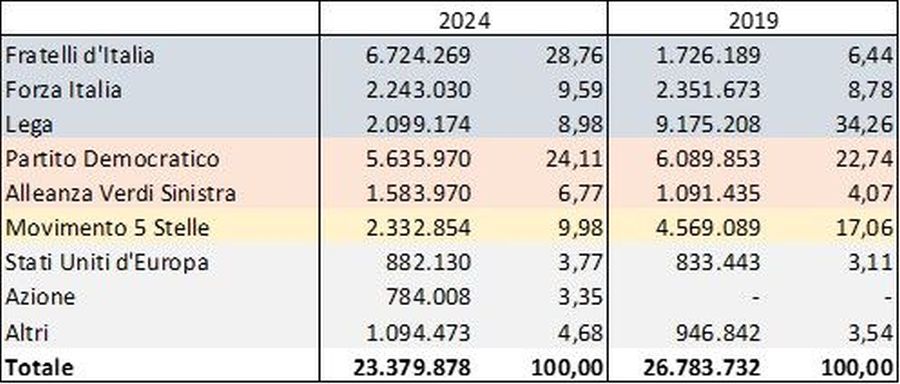 Risultati elezioni europee 2019 e 2024(*) – voti e percentuali