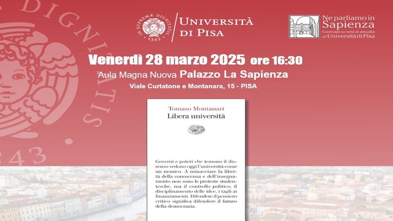 Venerdì 28 marzo, alle 16:30 nell’Aula Magna Nuova del Palazzo La Sapienza dell’Università di Pisa (via Curtatone e Montanara 15, Pisa) si parlerà di Libera Università con Tomaso Montanari, Rettore Università per Stranieri di Siena, e Riccardo Zucchi, Rettore Università di Pisa. Modera l’incontro Saulle Panizza, direttore del Centro per l’innovazione e la diffusione della cultura (Cidic) dell’Università di Pisa.