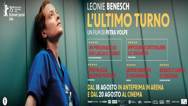 L’ultimo turno, regia di Petra Biondina Volpe, con Leonie Benesch (Floria Lind), Jasmin Mattei (Claudia Bach), Alireza Bayram (Jan Sharif), Andreas Beutler (Herr Hungerbühler), Lale Yavas (Frau Morina), Aline Beetschen (Evelyn Bühler), Sonja Riesen (Bea Schmid), Jürg Plüss (Herr Severin), Urs Bihler (Herr Leu), Eva Fredholm (Frau Bilgin), Dominique Lendi (Frau Frei), Doris Schefer (Pascale Schneider), Albana Agaj (Frau Osmani), Nicole Bachmann (Frau Dr. Strobel), Selma Jamal Aldin (Amelie Afshar), Margherita Schoch (Frau Kuhn); Genere: Drammatico, - Svizzera, Germania, 2025; Durata: 92’; Produzione: Bastian Griese, Lukas Hobi, Reto Schärli; Sceneggiatura: Petra Biondina Volpe; Fotografia: Judith Kaufmann; Musica: Emilie Levienaise-Farrouch; Bim Distribuzione; nelle sale cinematografiche da mercoledì, 20 agosto 2025.